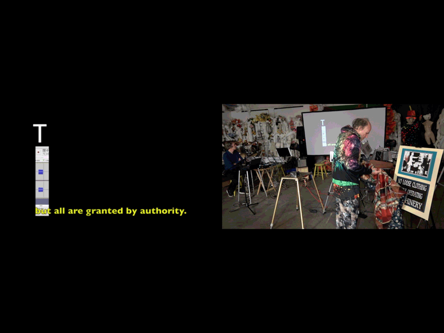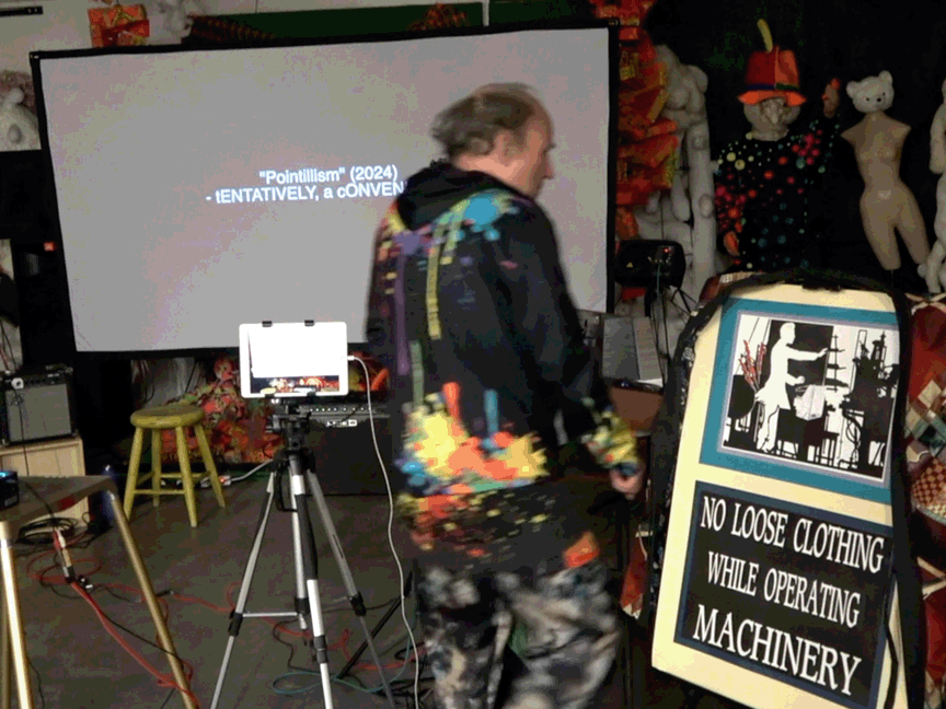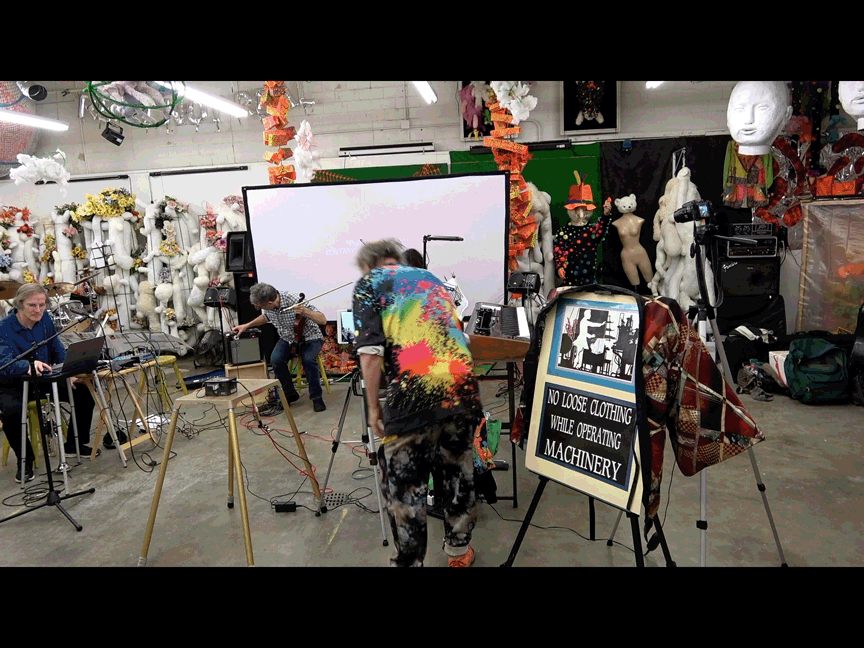An additional element, not called attention to, were a sign I posted & costume changes. I'd recently purchased a t-shirt, some hoodless sweatshirts, & some hooded sweatshirts. They all have flashy designs. I wore those & a kimono & took one element off at a time to expose something equally as flashy underneath until I got to the t-shirt for a bowling league. The kimono was hung over the back of a sign that read: No Loose Clohting While Operating Machinery but, thanks to my collaging, the "machinery" is a theremin. I'm not sure anyone in the audience noticed.