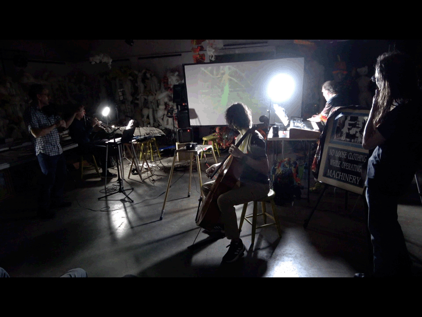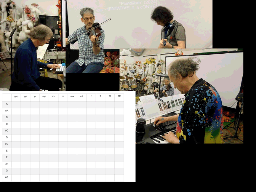 SOO, The Ticket that Exploded as reborn with members in Pittsburgh: myself (tENTATIVELY, a cONVENIENCE):electronics, moviemaking, violin, etc; Eric Lipsky: violin; Roger Dannenberg: trumpet & computer; &, In Roanoke, Richard Dannenberg: electric violin, cello - with a special guest appearance from Olchar E. Lindsann: voice.