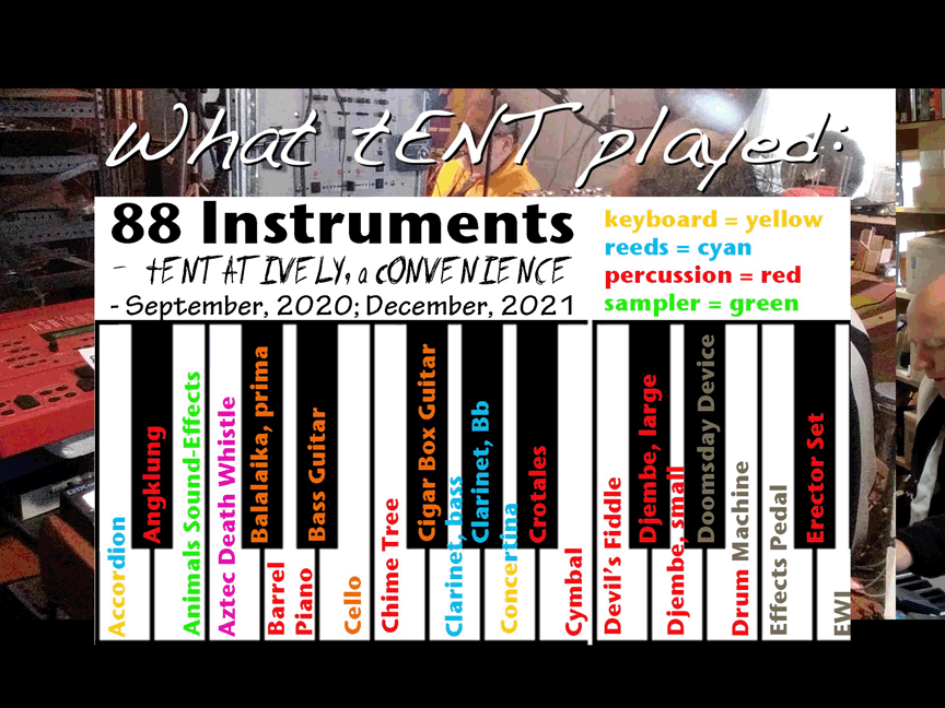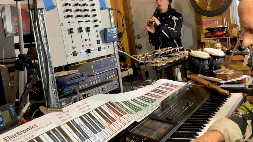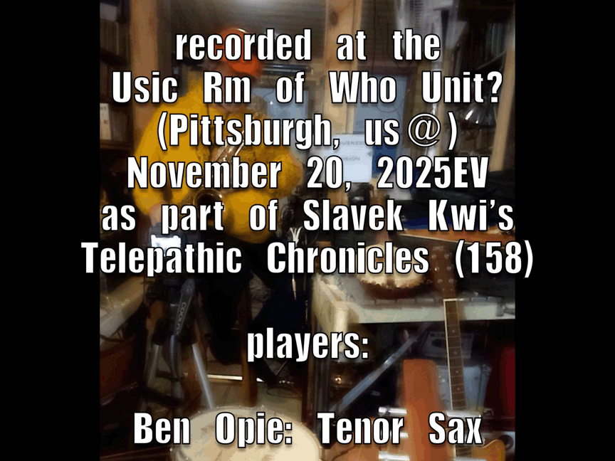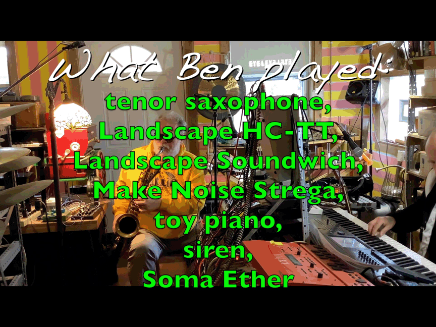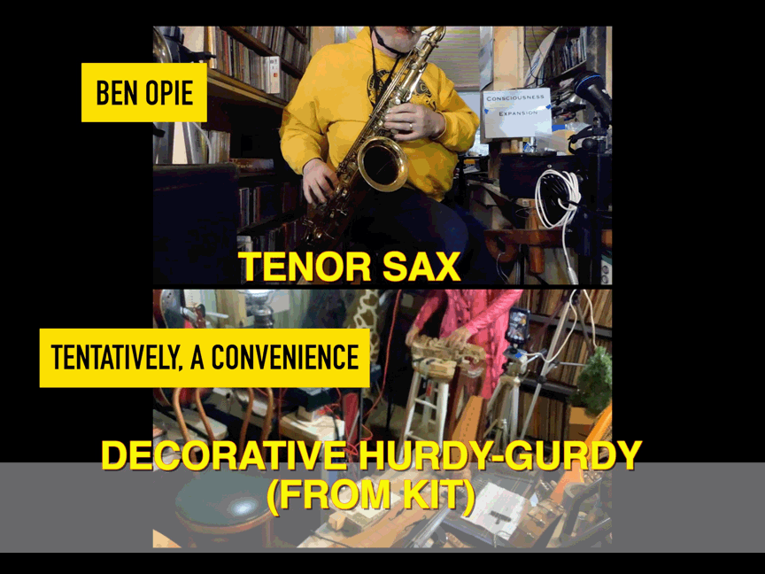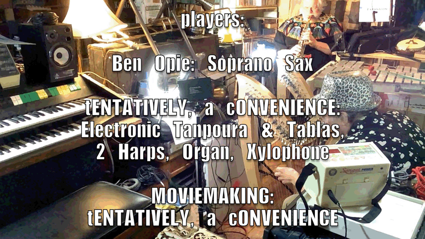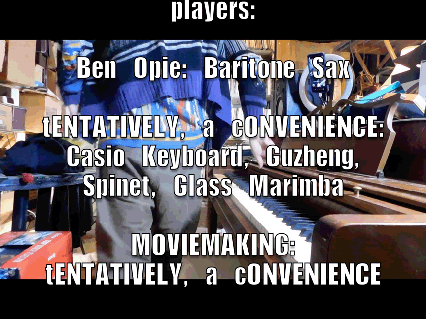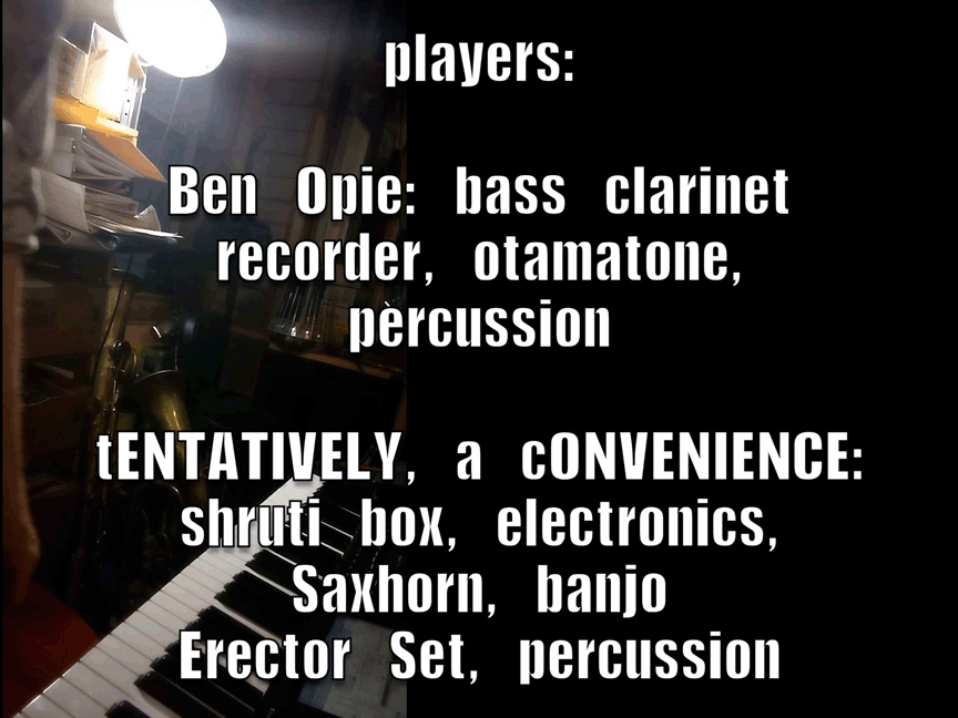 - Ben Opie: bass clarinet, recorder, otamatone, percussion; & myself, tENTATIVELY, a cONVENIENCE: shruti box, electronics, banjo, saxhorn, Erector Set, percussion, Small Nondo, etc