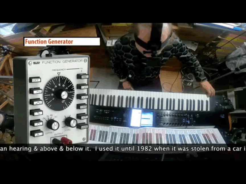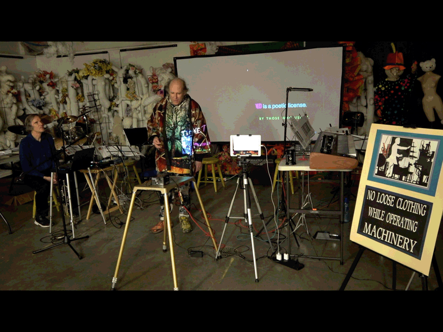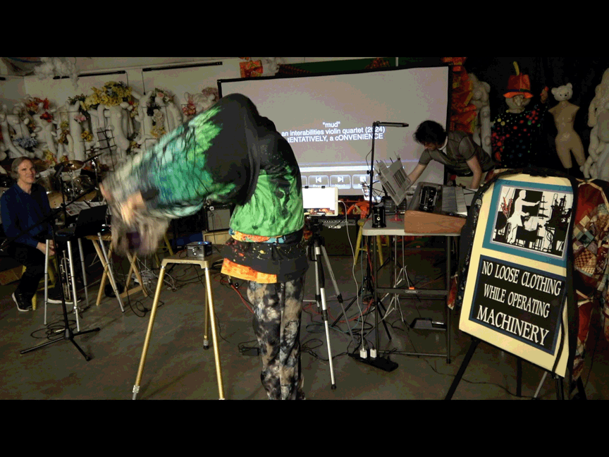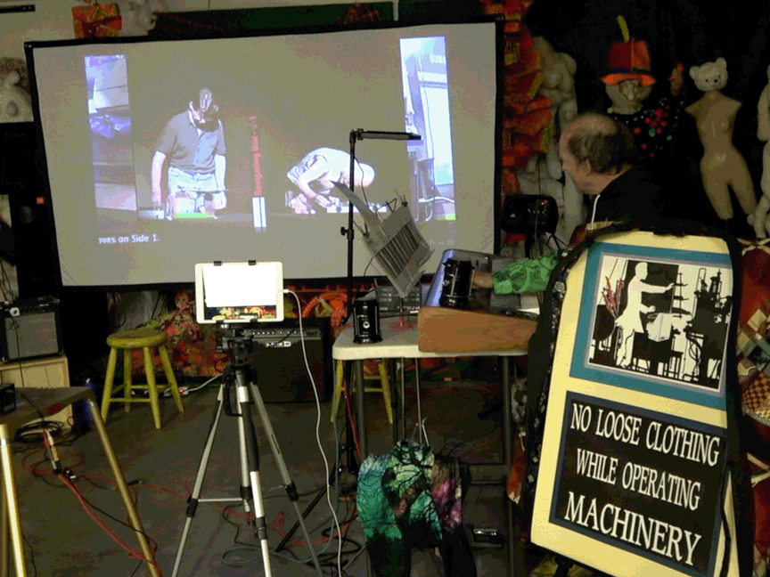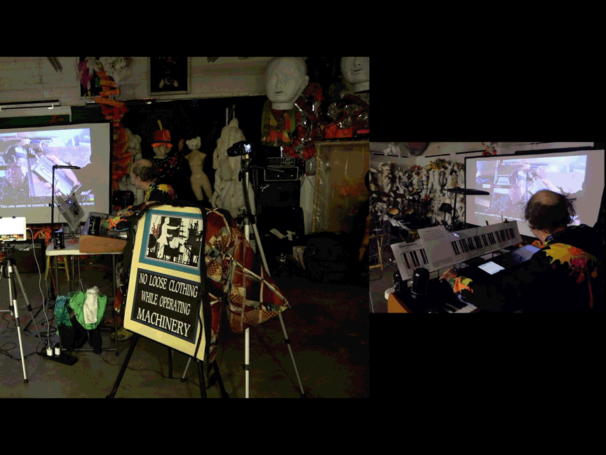 An additional element, not called attention to, were a sign I posted & costume changes. I'd recently purchased a t-shirt, some hoodless sweatshirts, & some hooded sweatshirts. They all have flashy designs. I wore those & a kimono & took one element off at a time to expose something equally as flashy underneath until I got to the t-shirt for a bowling league. The kimono was hung over the back of a sign that read: No Loose Clohting While Operating Machinery but, thanks to my collaging, the "machinery" is a theremin. I'm not sure anyone in the audience noticed.