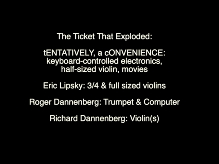 SOO, The Ticket that Exploded as reborn with members in Pittsburgh: myself (tENTATIVELY, a cONVENIENCE):electronics, moviemaking, violin, etc; Eric Lipsky: violin; Roger Dannenberg: trumpet & computer; &, In Roanoke, Richard Dannenberg: electric violin, cello - with a special guest appearance from Olchar E. Lindsann: voice.